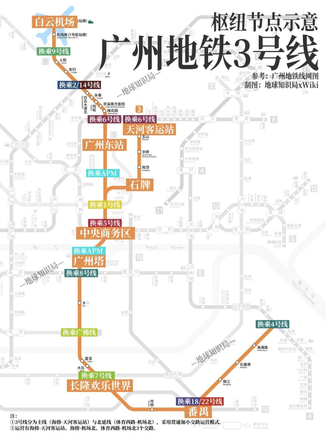 广州地铁3号线有别于常规Y型线,分叉站点体育西站位于城市核心区域,主线天河客运站终止于中心城区,共线段+北延段完整的贯通城市南北。